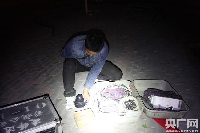 魏文軍借著手電筒的燈光整理放映設(shè)備。(央廣網(wǎng)記者 徐升 攝)