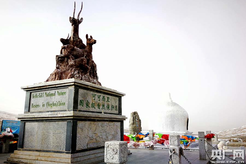 昆侖山口的可可西里自然保護(hù)區(qū)的藏羚羊雕塑(央廣網(wǎng)記者 張雷 攝)