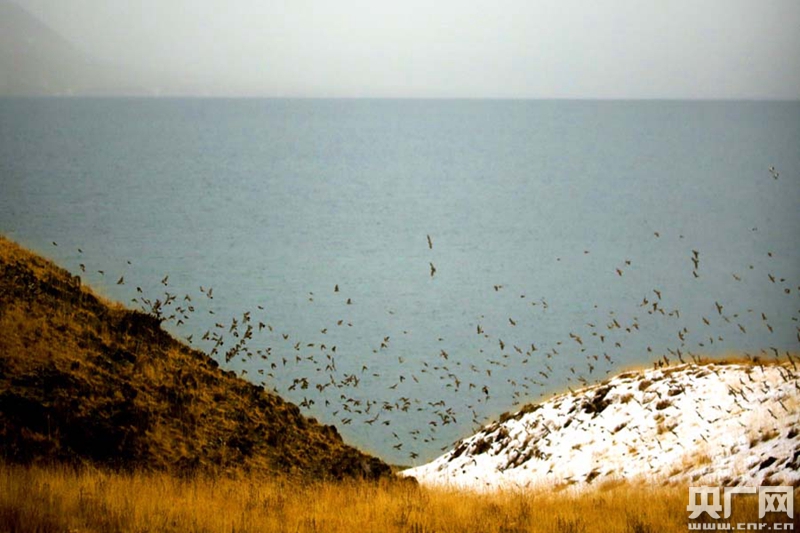 黃河源頭鄂陵湖飛翔的水鳥(niǎo)群(央廣網(wǎng)記者 張雷 攝)