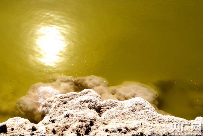 下車走到水邊觀察,只見(jiàn)鹽田邊是一圈白色的結(jié)晶體,像是給鹽田圍上了一條白色的項(xiàng)圈。岸邊的水呈黃綠色,鹽在水中自然析出絮狀結(jié)晶,像是在水中翻滾的云朵,可見(jiàn)含鹽量之高。