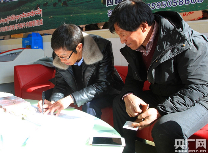 牧民正在領(lǐng)取出售牦牛的錢(qián)(央廣網(wǎng)記者 普布次仁 攝)