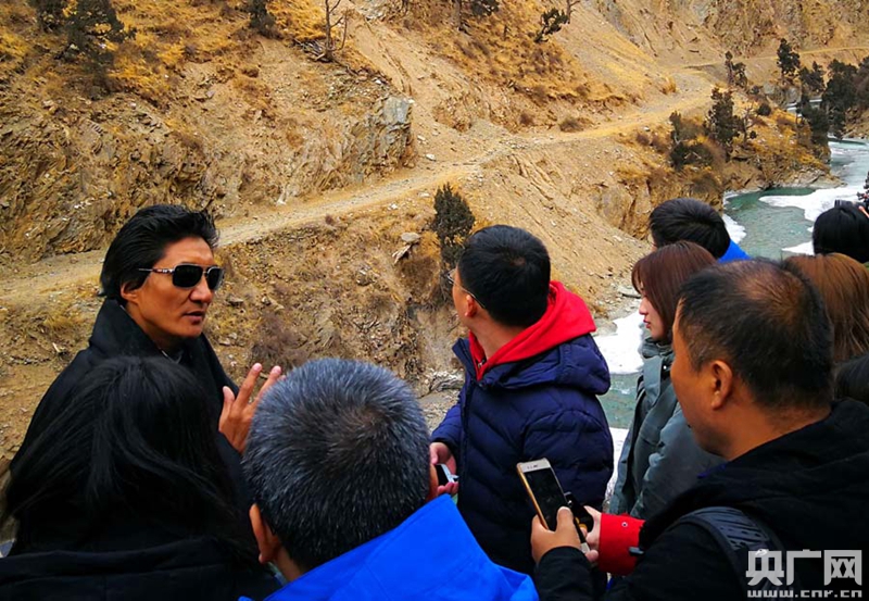 雪山鄉(xiāng)鄉(xiāng)長(zhǎng)旦正才讓在現(xiàn)場(chǎng)介紹當(dāng)年修公路的情形(央廣網(wǎng)記者 張雷 攝)