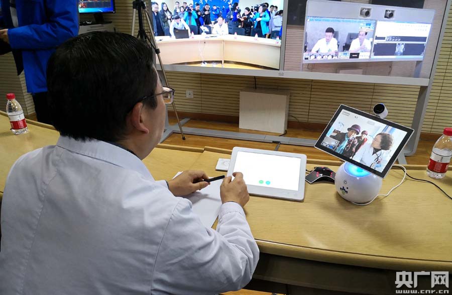 西寧市第一醫(yī)療集團(tuán)總院專家正在利用遠(yuǎn)程會(huì)診系統(tǒng)對(duì)分院患者進(jìn)行診斷(央廣網(wǎng)記者葛修遠(yuǎn)攝)