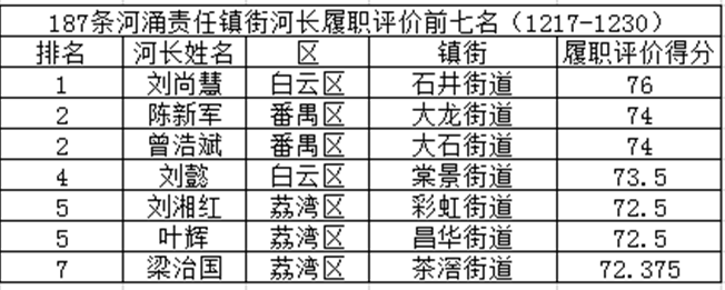 同時,本期公布了187條河涌鎮(zhèn)(街)河長履職評價(jià)前七名和村(居)級河長履職評價(jià)前十名名單。另外,本期河長履職情況整體不錯較上月都有明顯進(jìn)步,為此本期暫不曝光最后幾名。鎮(zhèn)(街)級河長履職前七名分別是:白云區(qū)石井街道劉尚慧、番禺區(qū)大龍街道陳新軍、番禺區(qū)大石街道曾浩斌、白云區(qū)棠景街道劉懿、荔灣區(qū)彩虹街道劉湘紅、荔灣區(qū)昌華街道葉輝、荔灣區(qū)茶滘街道梁治國。村(居)級河長履職前十名分別是(個別分?jǐn)?shù)一樣):番禺區(qū)小谷圍街道屈哨兵、荔灣區(qū)嶺南街道和平社區(qū)居民委員會蕭潔雯、花都區(qū)新雅街道雅瑤舊村村委會鄧榮添、番禺區(qū)南村鎮(zhèn)塘西村民委員會邵豪英、花都區(qū)新雅街道廣塘村委會劉杞良、花都區(qū)新雅街道石塘村委會黃河燎、荔灣區(qū)昌華街道西關(guān)大屋社區(qū)居民委員會何敏婷、越秀區(qū)東山街道樂景社區(qū)居民委員會劉春苗、荔灣區(qū)嶺南街道清平社區(qū)居民委員會劉雯雯、荔灣區(qū)西村街道增埗社區(qū)居民委員會胡勇山、番禺區(qū)大龍街道茶東村民委員會曹英權(quán)、荔灣區(qū)南源街道環(huán)翠園社區(qū)居民委員會梁曉華、番禺區(qū)鐘村街道鐘村四村民委員會盧杰洪、花都區(qū)新華街道新街村委會曾超波。