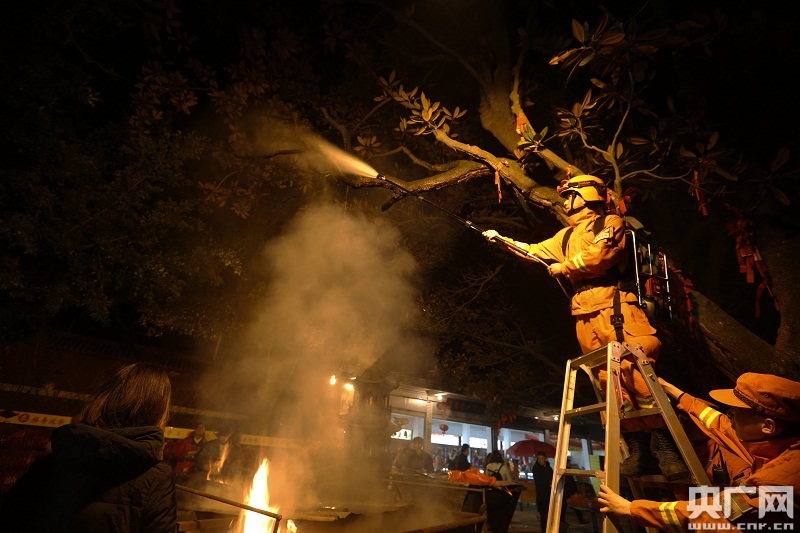 隨著時間推移,接近凌晨前來祈福的市民也越來越多!吧窒绬T同志,在大殿右香爐上方樹枝被火苗燎燃,請快速處理!卑l(fā)現(xiàn)險情后,涌泉寺工作人員立即向巡邏小分隊請求支援,班長楊進忠?guī)ьI(lǐng)四名隊員背上細水霧滅火機僅用五分鐘成功處置。