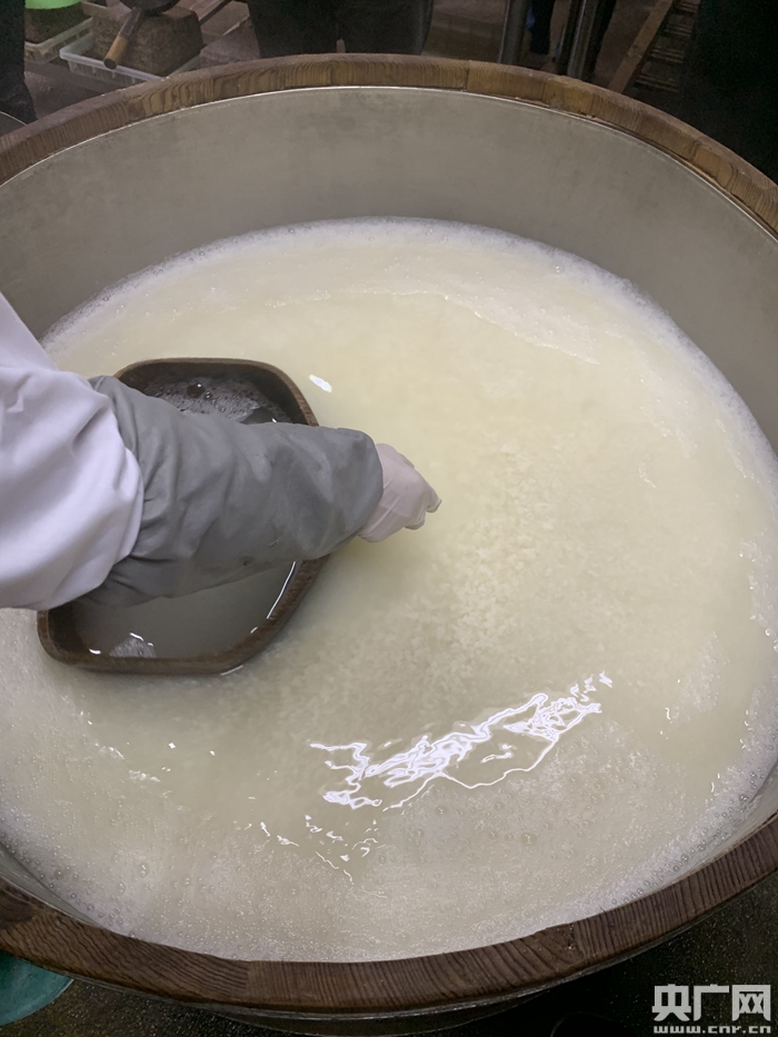 在位于上清溪旁的游客豆腐文化體驗(yàn)館里,陳小輝的女徒弟正在點(diǎn)鹵游漿,在一個(gè)直徑約一米的大木桶里,乘著熱騰騰的豆?jié){,只見這位女徒弟用一個(gè)木鏟在木桶一遍遍地轉(zhuǎn)動(dòng)著,陳小輝說,這是制作過程中最重要的一環(huán),決定著豆腐的口感。