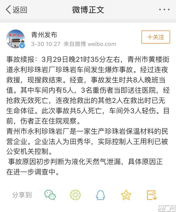 央廣網濰坊3月30日消息(記者劉?)記者從山東省青州市政府新聞辦官方微博@青州發(fā)布了解到,3月29日晚21時35分左右,青州市黃樓街道永利珍珠巖廠珍珠巖車間發(fā)生爆炸事故。經過連夜救援,現搜救結束。經查,事故發(fā)生時共8人晚班當值。其中車間內有5人,3名重傷者當即送往醫(yī)院,經搶救無效死亡,連夜搶救出的其他2人在救出時已無生命體征。此次事故共5人死亡,車間外3人輕傷。目前,傷者正在住院觀察。