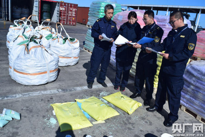 大連海事、海關(guān)聯(lián)手查獲危險(xiǎn)品硫酸銅瞞報(bào)案件(央廣網(wǎng)發(fā) 劉世方 攝)