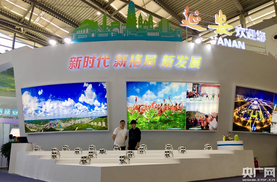 參展者觀看延安市展廳前的機(jī)器人表演(央廣網(wǎng)見習(xí)記者 王文爽 攝)