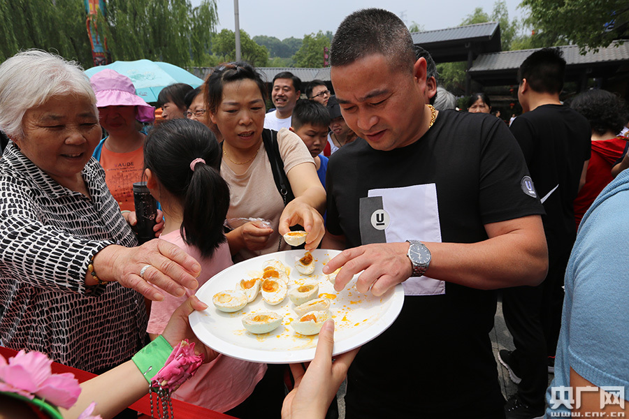 6月2日,景區(qū)工作人員為游客免費派發(fā)咸鴨蛋。(央廣網(wǎng)記者魏煒 攝)