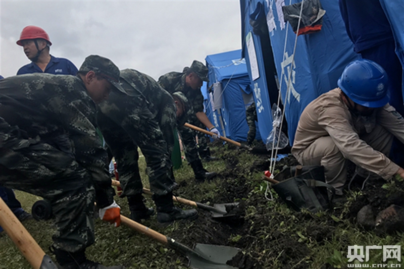 6月20日上午,記者在長(zhǎng)寧縣雙河鎮(zhèn)雙河中學(xué)運(yùn)動(dòng)場(chǎng)安置點(diǎn)看到,一頂頂救災(zāi)帳篷整齊排列,武警官兵正在帳篷周圍開挖排水溝,以確保下雨時(shí),雨水也不會(huì)流到帳篷里。武警瀘州支隊(duì)唐朝波告訴記者,他們?cè)诿總(gè)帳篷周圍都建立了排水溝,空曠的地方建立排水溝主干道,在帳篷周圍建立排水溝次干道,由高到低,這樣水就不會(huì)涌入帳篷里面,可以確保帳篷里面干燥。