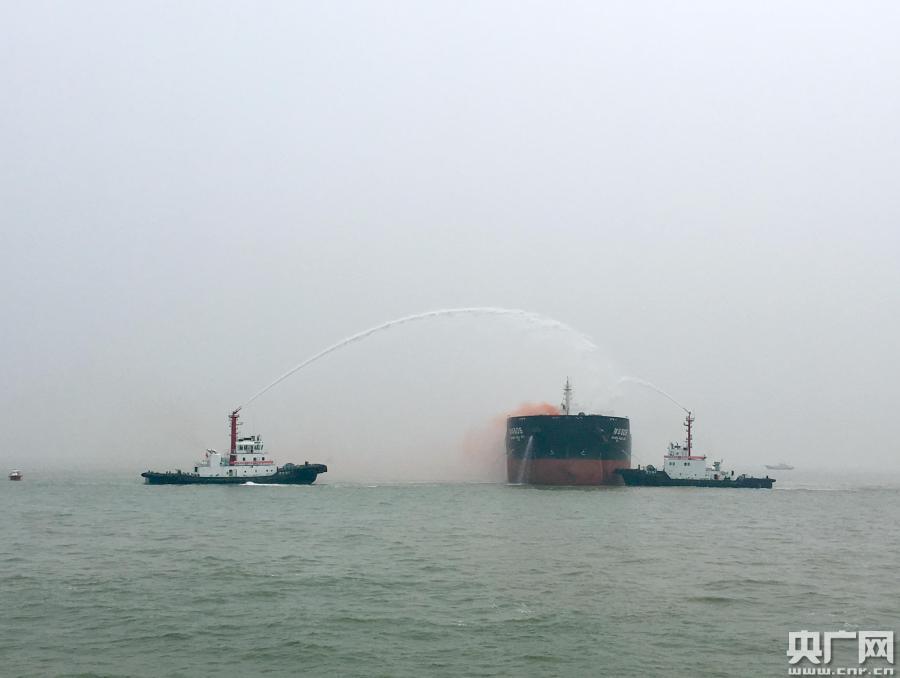 演習現(xiàn)場,兩艘救援船在協(xié)助“神華505”滅火。(央廣網(wǎng)見習記者 張曉琳 攝)