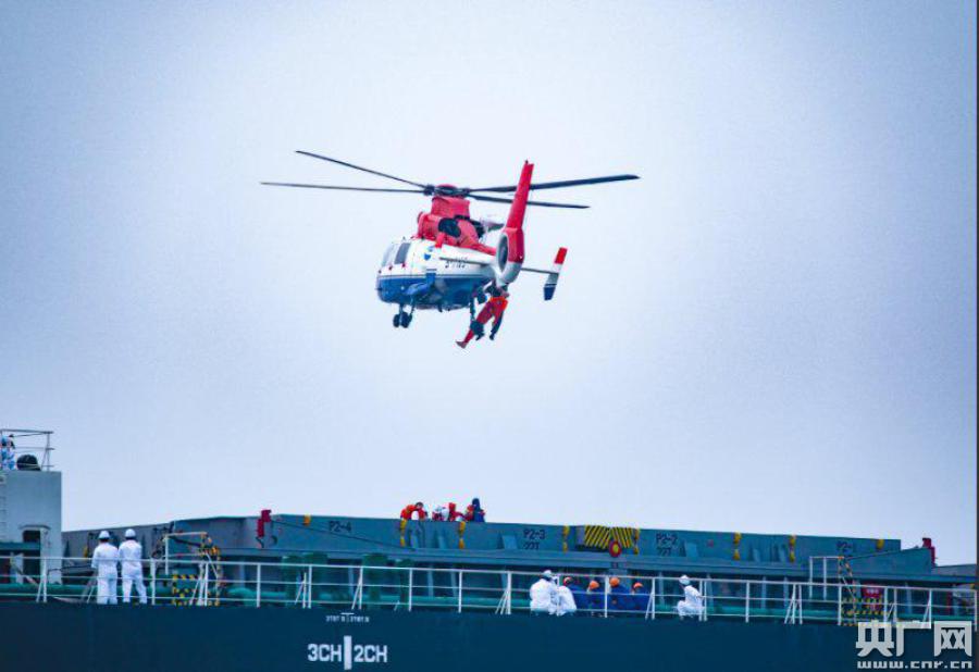 演習現(xiàn)場,直升機在轉(zhuǎn)移船上傷員。(央廣網(wǎng)發(fā) 滄州海事局供圖)