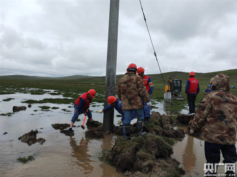 7月6日,國(guó)網(wǎng)玉樹(shù)供電公司員工正在緊急處理發(fā)生傾斜的電線桿(央廣網(wǎng)發(fā) 徐曉韜 攝)