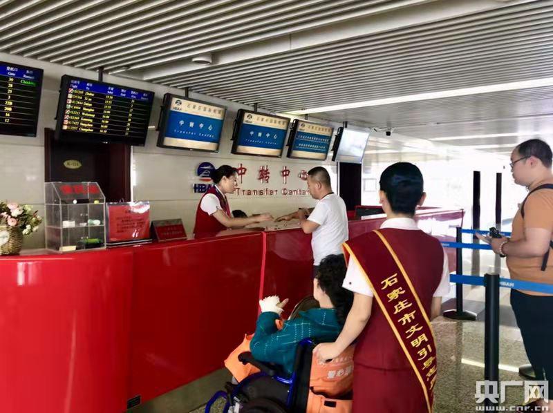 石家莊機(jī)場(chǎng)中轉(zhuǎn)中心工作人員正在為旅客辦理中轉(zhuǎn)服務(wù)(央廣網(wǎng)見(jiàn)習(xí)記者 閆金楓 攝)