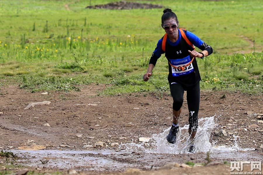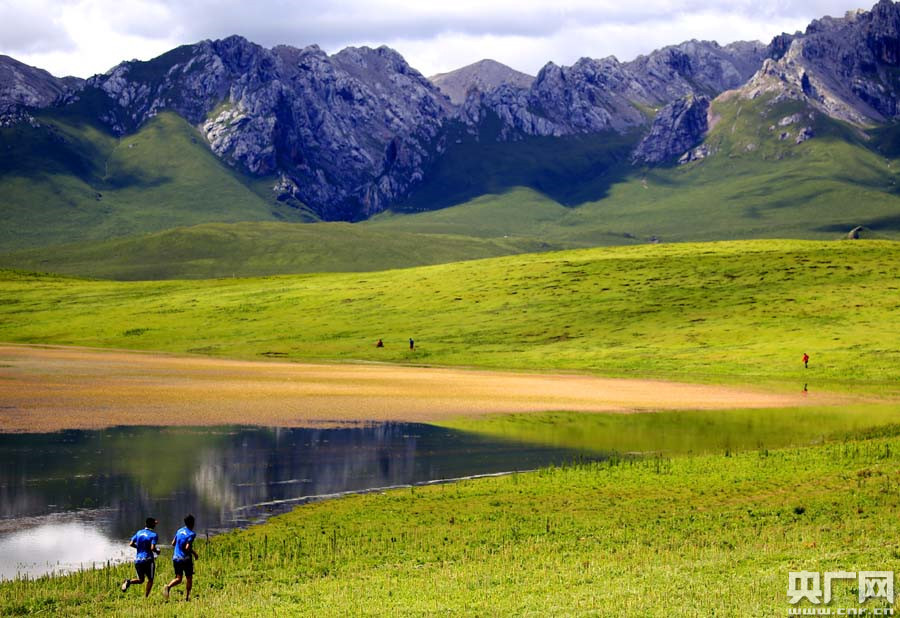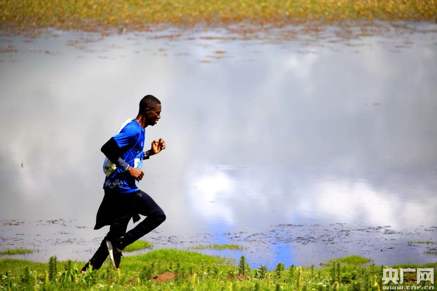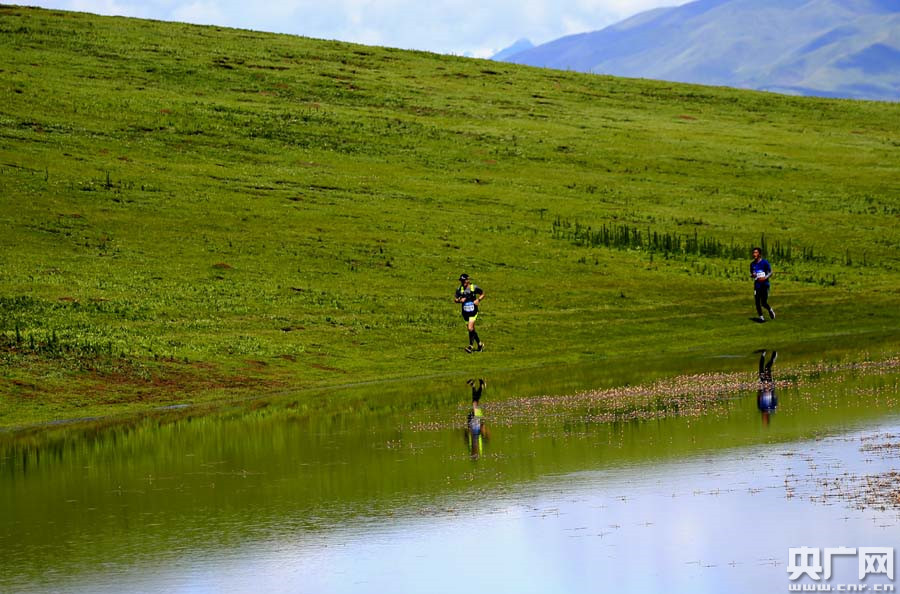 外國選手跑過美麗的草甸湖泊(央廣網(wǎng)記者 張雷 攝)