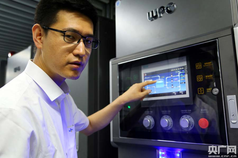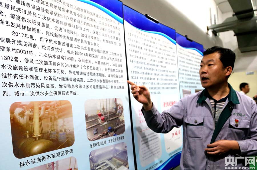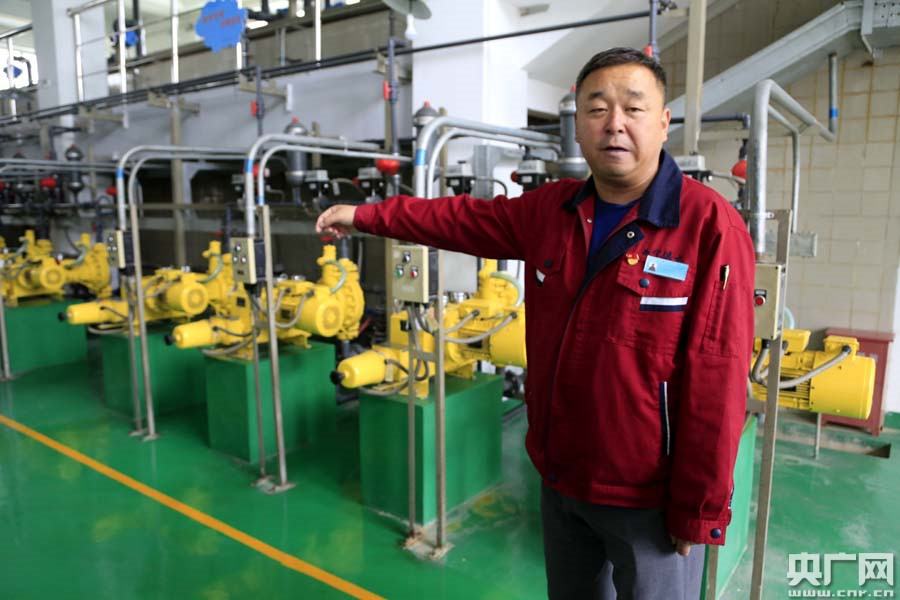 西寧市第七水廠廠長(zhǎng)邵龍?jiān)诮榻B凈化水裝置(央廣網(wǎng)記者 張雷 攝)