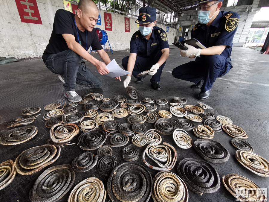 根據(jù)海關(guān)風險布控指令,廣州海關(guān)所屬海珠海關(guān)對某企業(yè)以一般貿(mào)易方式申報進口的10.82噸干制蛤蚧(大壁虎)、烏梢蛇干(烏梢蛇)實施開箱檢查,并取樣送華南野生動物物種鑒定中心進行鑒定。經(jīng)鑒定,該批貨物中含有滑鼠蛇干256.8千克,南洋眼鏡蛇干128.8千克,屬《瀕危野生動植物種國際貿(mào)易公約》(CITES)附錄II保護動物。