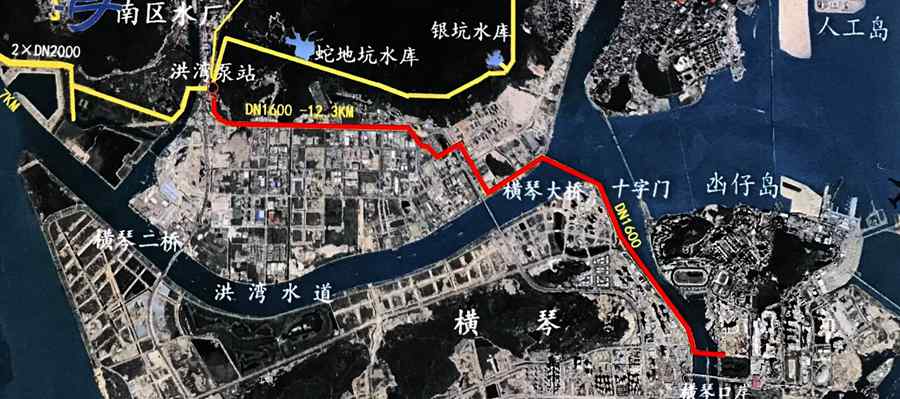 第四條對澳供水管道工程線路示意圖(紅線)。(央廣網(wǎng)發(fā) 珠海水務局供圖)
