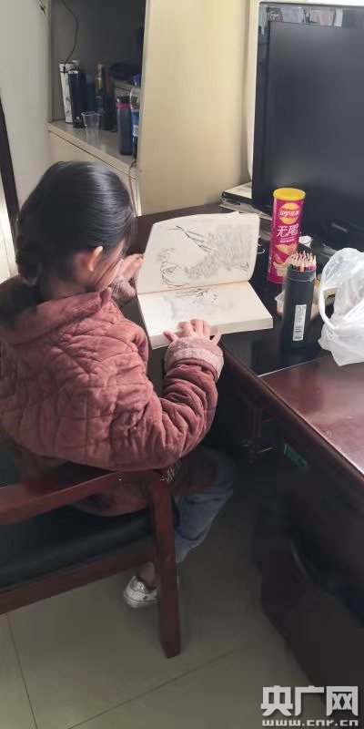 丟失的小女孩在民警照料下安靜地在派出所看書(央廣網(wǎng)發(fā) 五里界派出所供圖)