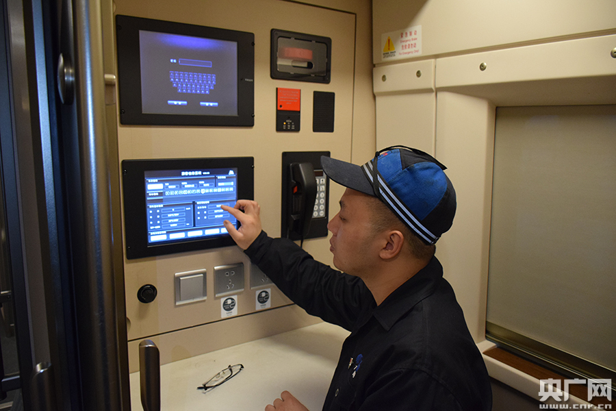 徐海洋正在復(fù)興號(hào)監(jiān)控室測(cè)試旅客服務(wù)信息系統(tǒng)播報(bào)情況(央廣網(wǎng)發(fā) 萬(wàn)新 攝)