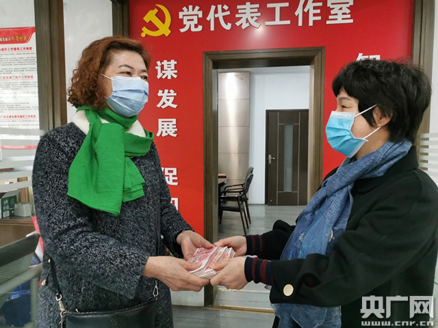 徐亞飛(左)將3萬(wàn)元現(xiàn)金交到了社區(qū)黨委書(shū)記張靜波手中(央廣網(wǎng)發(fā) 招寶山街道供圖)