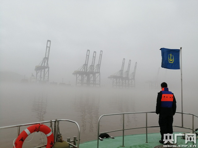 在大榭港區(qū),海事執(zhí)法人員當(dāng)起了“海上快遞小哥”。15日一大早,他們將蔬菜、水果、米面等一批“貨物”扛上了“海巡07132”艇的甲板。趁著海上濃霧終于有了減弱的勢頭,能見度一達(dá)到安全出艇的條件,就立刻出發(fā)“送貨”。“這兩天受到濃霧和寒潮大風(fēng)的影響,海域天氣情況不太好,我們要抓緊霧和風(fēng)都相對較小的‘窗口期’,把物資趕緊送到船上,不能讓船員兄弟們久等!”寧波大榭海事處榭北海巡執(zhí)法大隊(duì)大隊(duì)長李宣達(dá)說。