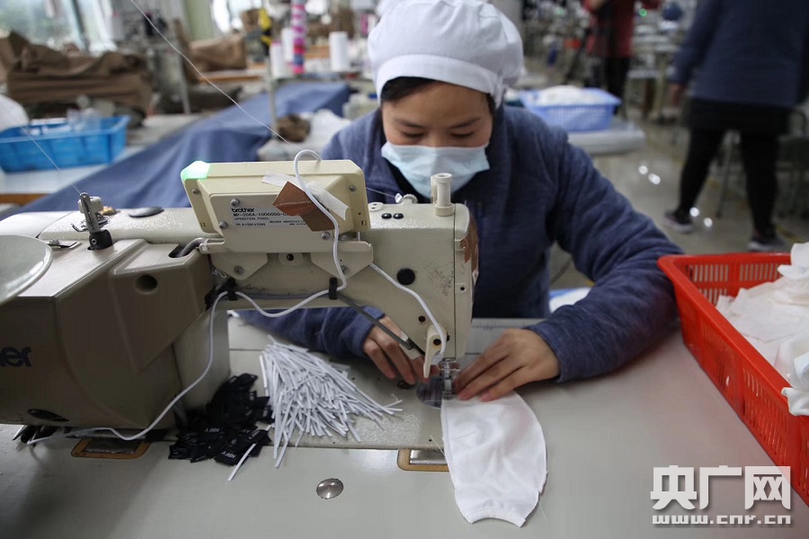 企業(yè)生產(chǎn)車間工人正在趕制口罩(央廣網(wǎng)發(fā) 江北區(qū)供圖)