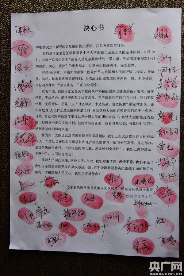 3月1日上午,湘雅二醫(yī)院援武漢武昌方艙醫(yī)院醫(yī)療隊(duì)全體成員一致立下決心書,以徐軍美副院長(zhǎng)為首的42名隊(duì)員在上面簽名并按下了鮮紅的手印。