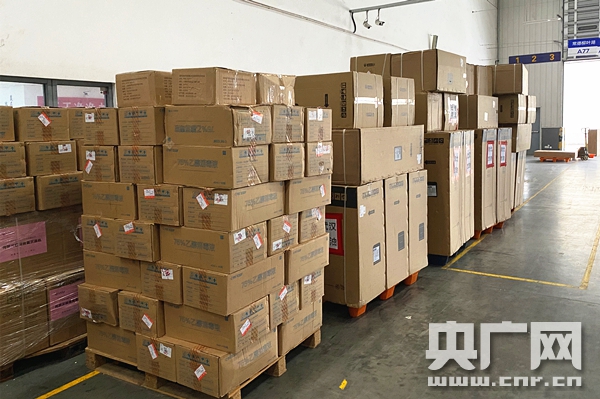 一批從國外和國內(nèi)其他城市至長(zhǎng)沙的防疫物資準(zhǔn)備轉(zhuǎn)運(yùn)至武漢(央廣網(wǎng)記者 堯遙 攝)