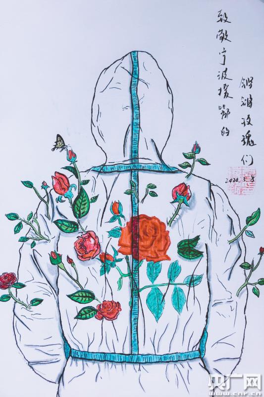 寧波支援武漢醫(yī)療隊成員葛挺醫(yī)生的兒子創(chuàng)作的畫作,獻給一線女神(央廣網(wǎng)發(fā) 通訊員趙冠菁 攝)