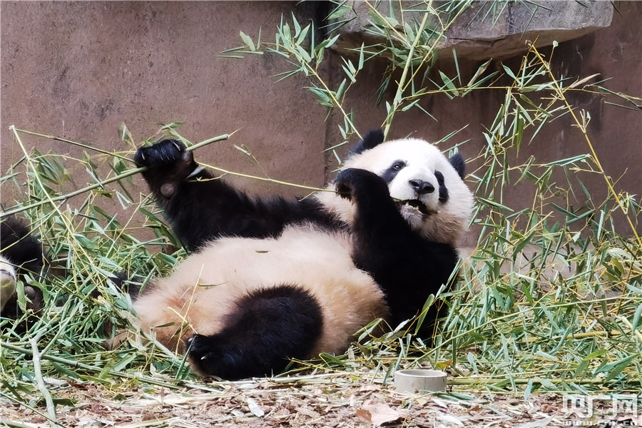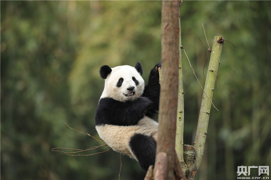 大熊貓?jiān)诔灾褡樱ㄑ霃V網(wǎng)發(fā) 成都熊貓基地供圖)