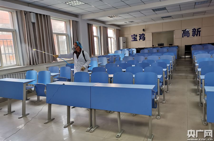 圖為寶雞市石油中學(xué)對教室進(jìn)行消殺(央廣網(wǎng)記者 舒隆煥 攝)