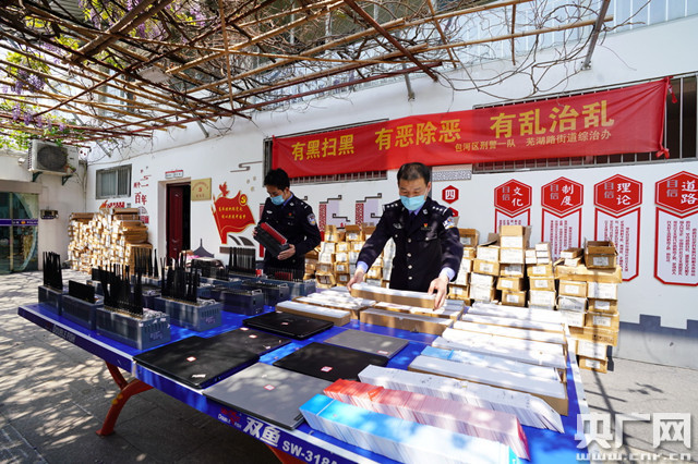 民警對繳獲的物品進行清點(央廣網(wǎng)發(fā) 合肥市公安局供圖)