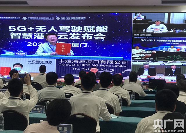 當天,中國遠洋海運集團有限公司、中國移動通信集團有限公司和東風汽車集團有限公司聯(lián)合在北京、上海、武漢、十堰、香港和廈門六個城市,通過中國移動5G+云視訊系統(tǒng)舉行“5G+無人駕駛賦能智慧港口”云發(fā)布會,廈門市市長莊稼漢、東風汽車集團董事長竺延風、中國移動集團董事長楊杰、中遠海運集團董事長許立榮等領導和嘉賓,分別在各會場“云”見證了這臺港口無人駕駛集裝箱卡車現(xiàn)場運行操作情況。