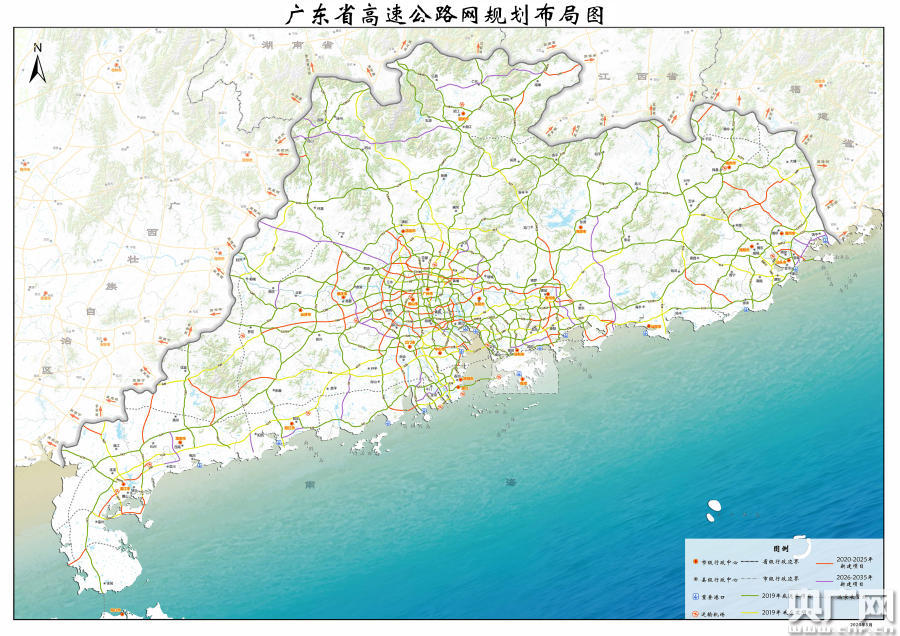 在規(guī)劃布局上,廣東將以“十二縱八橫兩環(huán)十六射”為主骨架,七十條加密線和聯(lián)絡(luò)線為補充,形成以珠江三角洲為核心,沿海城市、港口、機場和鐵路樞紐為重點,支撐粵港澳大灣區(qū)深度合作發(fā)展、引領(lǐng)東西兩翼及沿海經(jīng)濟帶發(fā)展、快捷通達(dá)周邊省區(qū)的高速公路網(wǎng)絡(luò)。到2035年,全省高速公路總里程達(dá)到約15000公里。規(guī)劃預(yù)留了深圳大鵬至深汕合作區(qū)、平遠(yuǎn)經(jīng)蕉嶺至大埔、瓊州海峽跨海通道等18 條約1200公里的遠(yuǎn)景展望線。