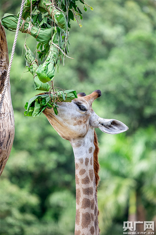 長頸鹿的粽子里則是桑葉,掛在高高的樹枝上,長頸鹿舔著長長的舌頭,吃得津津有味。
