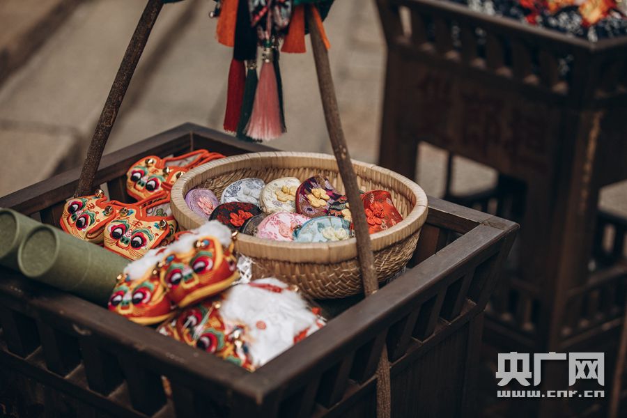貨郎擔(dān)子中挑著當(dāng)?shù)囟宋缑朗骋约鞍菹隳摇⒒㈩^鞋等(央廣網(wǎng)發(fā) 通訊員供圖)