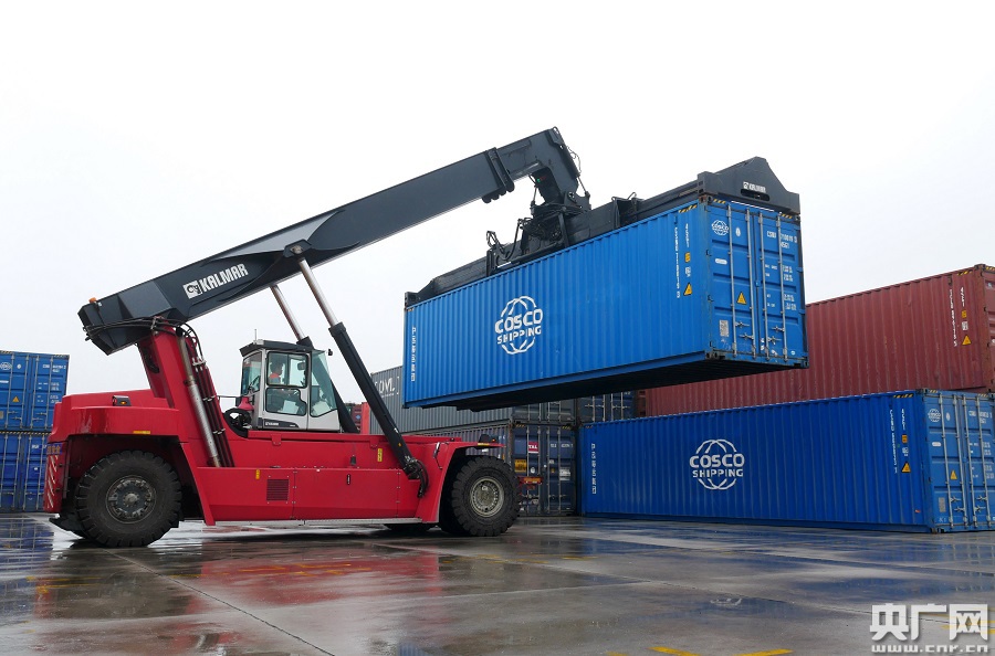 7月24日,作業(yè)人員在西安新筑車站貨場吊運(yùn)中歐班列集裝箱。(央廣網(wǎng)發(fā) 唐振江 攝)