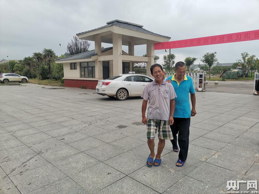 陳興廠攙扶著陳興來(lái)在安置點(diǎn)內(nèi)散步。(央廣網(wǎng)發(fā) 葛曉軍 攝)