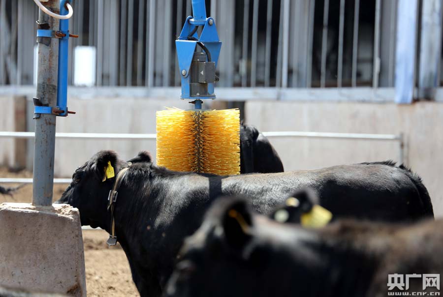 牛舍里大大小小的智能化設(shè)備都或多或少地顯示了這是一家現(xiàn)代科技含量十足的養(yǎng)殖基地,與傳統(tǒng)的養(yǎng)殖場有很大的不同。臉上曬得黑里透紅的基地負(fù)責(zé)人楊劍在現(xiàn)代化的牛圈里,干脆拉下了口罩:“看看,我們的牛圈空氣里,沒有濃烈的氣味;牛舍一直保持著干燥整潔,自行研制的牛體刷為牛兒們自動按摩,所有的牛都在攝像頭下活動,嚴(yán)禁給它們使用抗生素的藥物。這酷似五星級賓館的牛舍,才能產(chǎn)出高品質(zhì)的安格斯牛肉!”