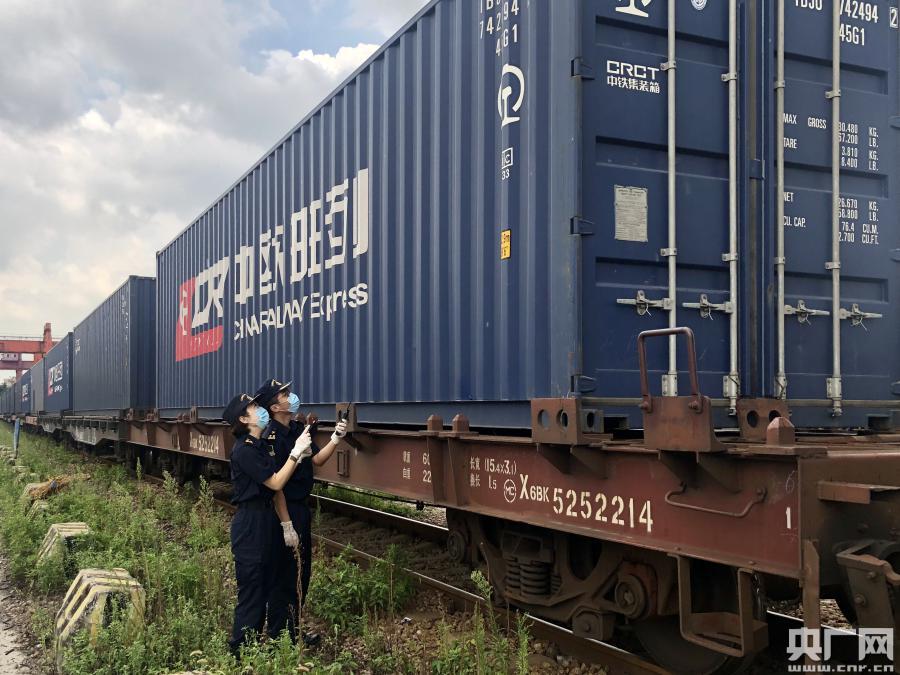 廣州海關(guān)所屬廣州車站海關(guān)關(guān)員對(duì)發(fā)運(yùn)前的班列集裝箱標(biāo)識(shí)號(hào)進(jìn)行核查 (央廣網(wǎng)發(fā) 海關(guān)供圖)
