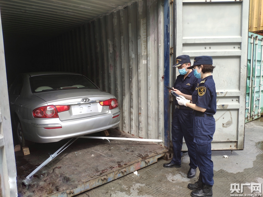 廣州海關(guān)所屬廣州車站海關(guān)關(guān)員對(duì)發(fā)運(yùn)的二手車進(jìn)行查驗(yàn) (央廣網(wǎng)發(fā) 海關(guān)供圖)