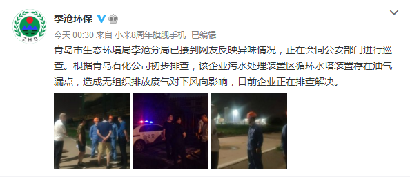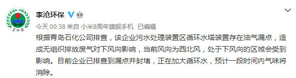 “李滄環(huán)!北硎,青島石化公司廠區(qū)東南角處一處冷卻循環(huán)水塔,因存在柴油泄露問(wèn)題產(chǎn)生的異味被風(fēng)機(jī)抽出,帶到空氣中,造成對(duì)下風(fēng)向部分區(qū)域產(chǎn)生影響。據(jù)該企業(yè)核實(shí),散逸的氣體對(duì)人體無(wú)害,不會(huì)產(chǎn)生易燃易爆或次生衍生災(zāi)害。目前,經(jīng)該企業(yè)緊急處置,漏點(diǎn)已于零時(shí)二十分處理完畢。