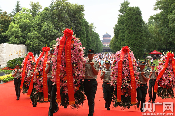 向抗戰(zhàn)烈士敬獻花籃(央廣網發(fā) 覃昆 攝)