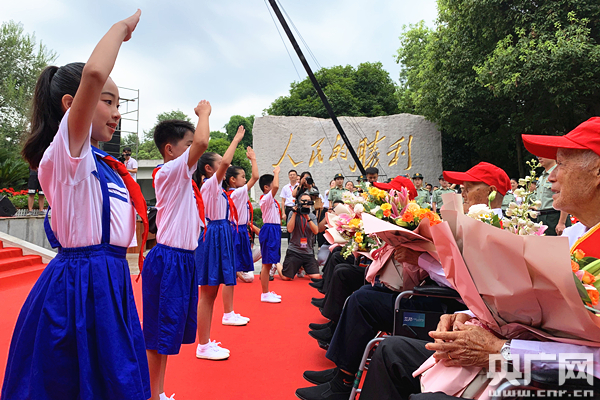 少先隊員向抗戰(zhàn)老兵敬獻鮮花(央廣網發(fā) 覃昆 攝)