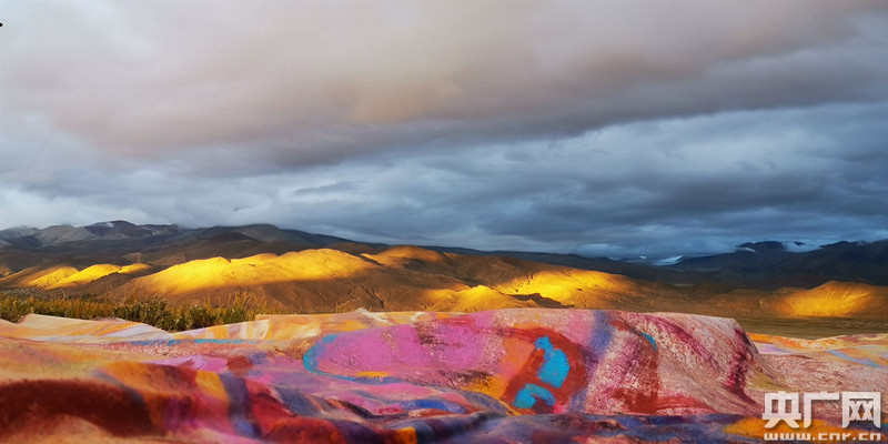 央廣網(wǎng)廣州9月20日消息(記者何偉奇)83件巨幅畫(huà)作,由57頭牦牛馱負(fù)著,沿著山坡曲線,在陽(yáng)光、藍(lán)天、白云、雪山、曠野和風(fēng)共同創(chuàng)構(gòu)的場(chǎng)域中,搭設(shè)成一道寄予著人們美好祈愿的彩虹,面對(duì)珠穆朗瑪山峰徐徐展開(kāi)。這是華南理工大學(xué)建筑學(xué)院美術(shù)教研室主任、視覺(jué)藝術(shù)實(shí)驗(yàn)室主任王義明帶領(lǐng)著廣東藝術(shù)團(tuán)隊(duì)9月18-19日在西藏日喀則崗嘎鎮(zhèn)展開(kāi)的人與自然合力創(chuàng)作。