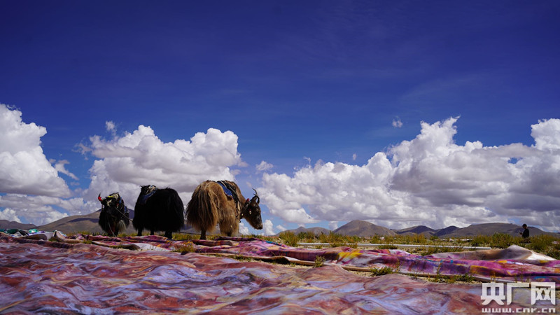 展示現(xiàn)場(chǎng),參與的人們懷揣共同的祈愿,牽引高原牦牛,搬運(yùn)著畫(huà)布,朝著珠峰方向緩緩行進(jìn),隨后抵達(dá)平緩山坡。92位現(xiàn)場(chǎng)人員、57頭牦牛共同將83條畫(huà)布搭設(shè)成一道寬15米、長(zhǎng)400米的高原之《虹》,隨著山坡起伏蜿蜒、浮動(dòng)。