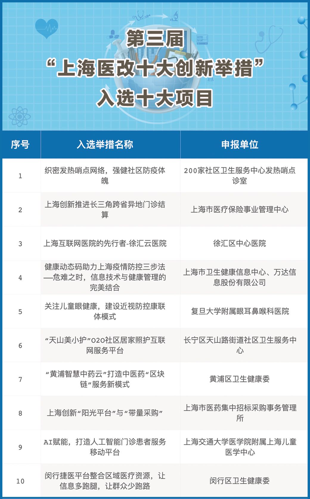 今年的評選活動正值抗疫期間,但社會反響依舊熱烈,共收到辦醫(yī)主體、醫(yī)療衛(wèi)生機(jī)構(gòu)和市級衛(wèi)生計生相關(guān)學(xué)會(協(xié)會)等推薦申報的58條舉措。經(jīng)過專家嚴(yán)格遴選,產(chǎn)生了27條入圍舉措,并通過“健康上海12320”官方微信接受市民投票。日前,第三屆“上海醫(yī)改十大創(chuàng)新舉措”評選結(jié)果正式出爐,現(xiàn)向社會公布。這些獲獎、入圍舉措引起社會強(qiáng)烈反響,全方位展示了上海醫(yī)改的突破性進(jìn)展和積極成效,為上海、長三角乃至全國居民就醫(yī)帶來了實實在在的獲得感、幸福感。