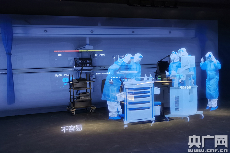 “ICU里的生死競(jìng)速”展區(qū),吸引了不少觀眾的眼球。目及之處是用全息技術(shù)做的ICU場(chǎng)景:由麻醉科醫(yī)生和護(hù)士組成與生命競(jìng)速的“插管小分隊(duì)”,“貼面”插管,搶救危重癥患者。本次抗擊新冠肺炎疫情專題展覽設(shè)計(jì)負(fù)責(zé)人張振華介紹,用全息技術(shù)可以完整地再現(xiàn)整個(gè)故事,展示醫(yī)生在病房里救人的狀態(tài),配上音樂的節(jié)奏,強(qiáng)調(diào)與時(shí)間賽跑的氛圍。他說:“我們這樣設(shè)計(jì)的目的,一方面是想向一線的醫(yī)務(wù)人員表示致敬,另一方面是希望能真實(shí)還原他們舍身忘死、不畏危險(xiǎn)的工作狀態(tài)!